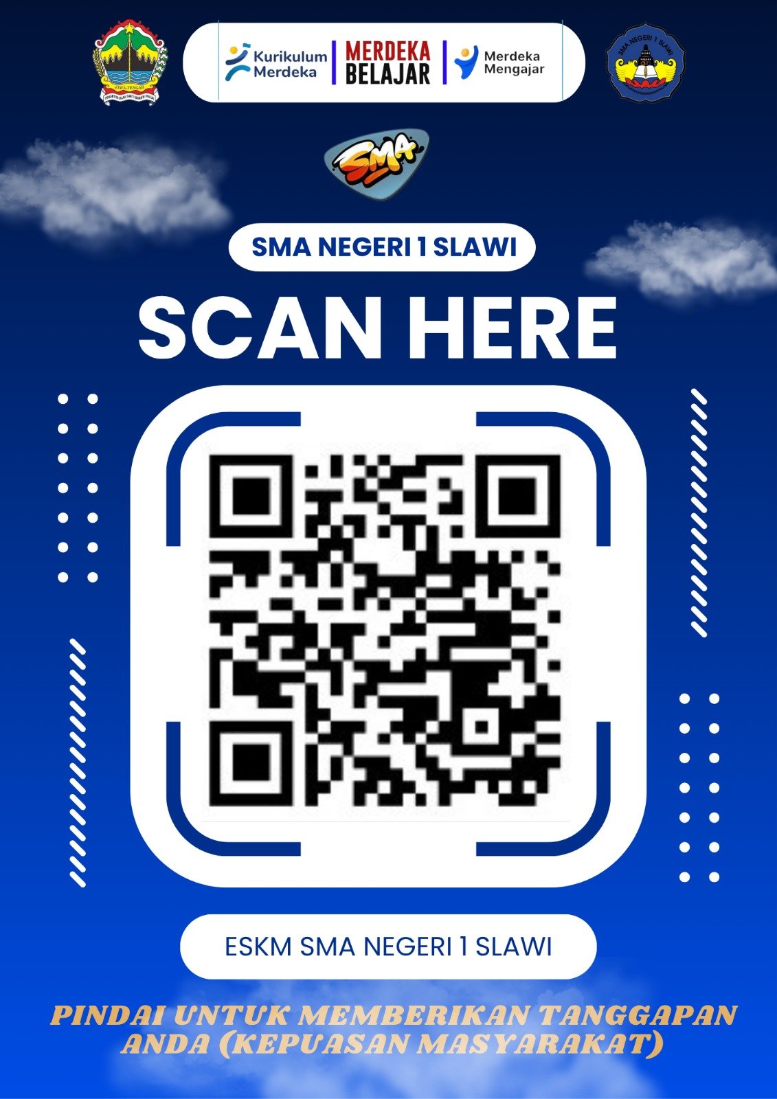 Sebagai bentuk komitmen SMA Negeri 1 Slawi dalam meningkatkan kualitas pelayanan pendidikan, kami menyediakan Survey Kepuasan Masyarakat (SKM).